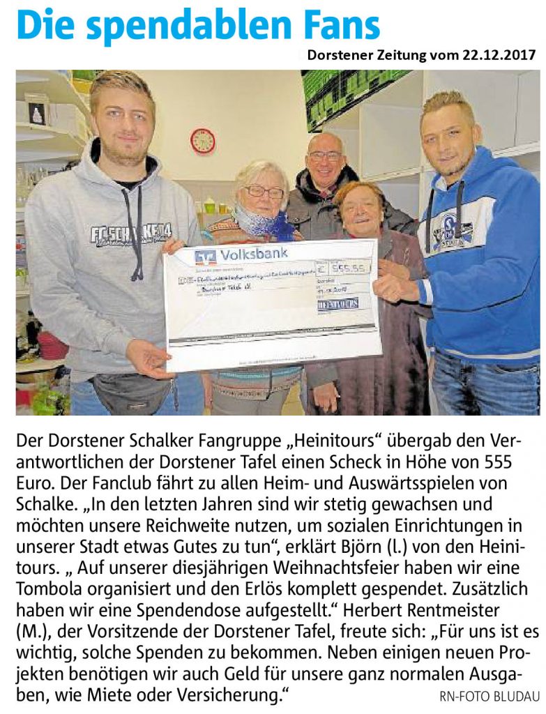 HEINITOURS ist eine Schalker Fangruppe aus Dorsten, die zu allen Heim- und Auswärtsspielen von Schalke 04 fährt. In den letzten Jahren stetig gewachsen, möchten sie ihre Reichweite nutzen, um sozialen Einrichtungen in ihrer Stadt etwas Gutes zu tun. Die Arbeit und das ehrenamtliche Engagement der Mitarbeiter der DORSTENER TAFEL, die einige der Gruppe schon aus ihrer Zeit an der Erich-Klausener-Realschule kannten, hat sie überzeugt.