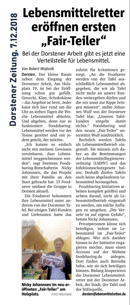 „Ich kann es nicht mit meinem Gewissen vereinbaren, dass gute Lebensmittel weggeschmissen werden.“ Mit einer kleinen programmatischen, engagierten Ansprache und im Beisein der Kooperationspartner Dorstener Arbeit, Stadt Dorsten, Stiftsquelle und Dorstener Tafel startete heute Nicky Johannsen, Botschafterin der Dorstener Foodsaver, diese Nachhaltigkeitsinitiative (siehe auch hier).