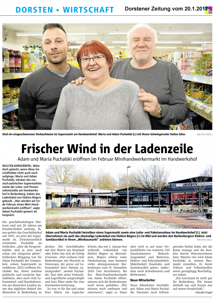 Alte neue Nachbarn 20. Januar 20176. Februar 2017 jotw Auch wenn wir uns bald eingekesselt fühlen müssten: Das Team der Dorstener Tafel wünscht den alten und neuen Nachbarn Familie Puchalski geschäftlich und persönlich alles Gute und freut sich auf weiterhin angenehme Nachbarschaft!